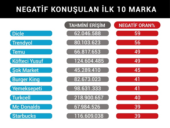 DİR100 Raporu’nda negatif konuşulma oranlarına göre sıralanan ilk 10 marka arasında %59 ile Dicle Elektrik, %56 ile Trendyol, %49 ile ise Temu ve Köfteci Yusuf dikkat çekti. E-ticaretten hızlı tüketime, iletişimden yemek platformlarına uzanan geniş bir sektör yelpazesinde yer alan bu markalar, yüksek erişim oranlarına sahip olmalarına rağmen dijital ortamda maruz kaldıkları olumsuz algının ne kadar etkili ve yaygın olabileceğini gözler önüne serdi.